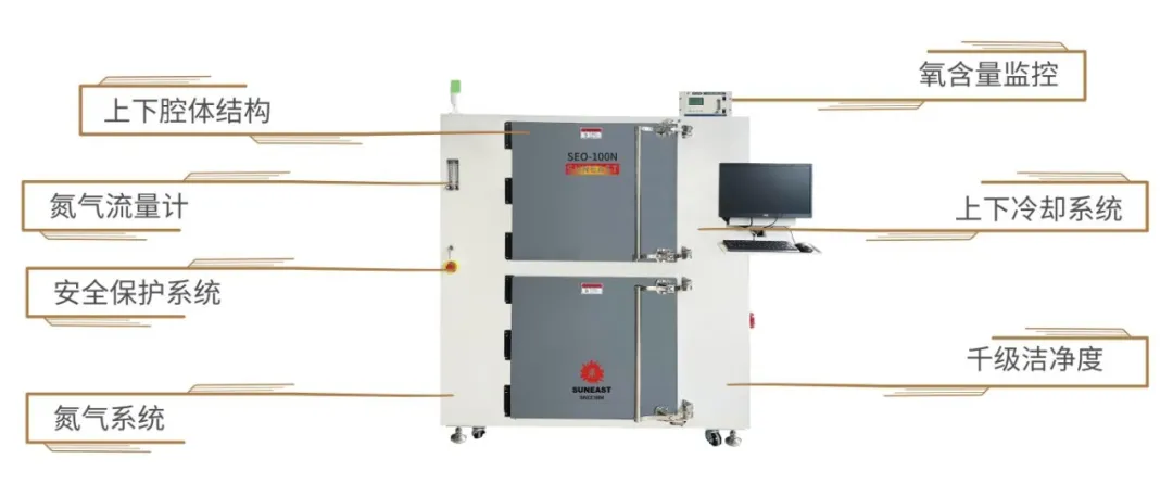 日東科技SEO系列半導(dǎo)體充氮烤箱通用性強(qiáng),通過充入氮?dú)鈱⒖鞠渲械难鯕馀懦觯乐购婵靖邷禺a(chǎn)生氧化現(xiàn)象。設(shè)備采用高容量水平空氣再循環(huán)系統(tǒng),采用專有的腔室結(jié)構(gòu)和密封技術(shù),具有出色的氣密性和溫度均勻性,滿足半導(dǎo)體產(chǎn)品高性能要求,適用于固化半導(dǎo)體晶圓、IC封裝(銅基板,銀膠,硅膠,環(huán)氧樹脂)、玻璃基板等產(chǎn)品烘烤。