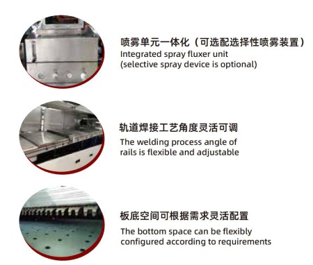 焊接系統:錫爐采用外熱式加熱,錫爐內膽采用鑄鐵制作,內表面防腐蝕處理;錫爐四周采用特制彈性材料密封,配置電動錫爐,錫爐可自由升降進出;